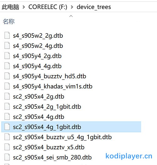 写入完成后打开U盘,进入device_trees文件夹。若你的设备内存为4G,网络为千兆,找到文件名为sc2_s905x4_4g_1gbit.dtb的文件。