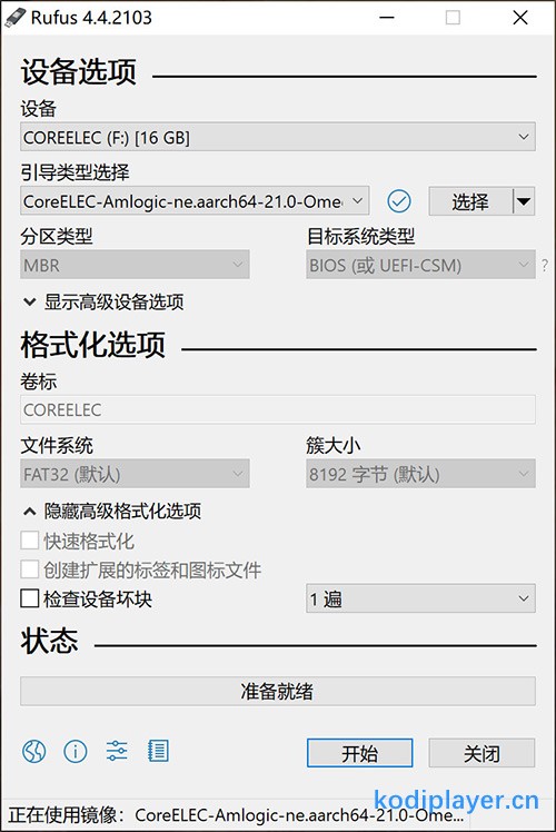 打开Rufus、win32磁盘映像工具、balenaetcher等之类烧写软件,把解压后的CoreELEC-Amlogic-ne.aarch64-21.0-Omega-Generic.img文件写入U盘,点“开始”。