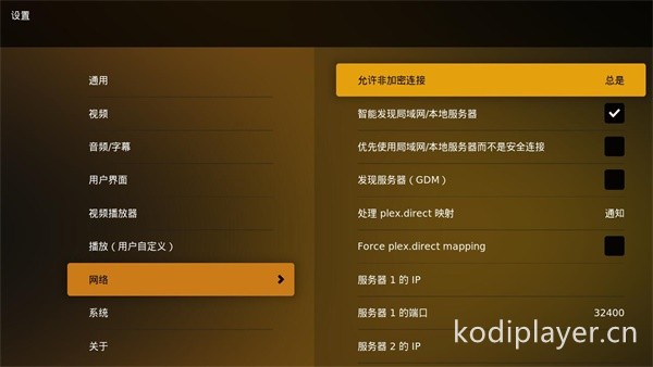 打开Kodi的Plex插件,“设置 - 网络 - 允许非加密连接”,设置为“总是”。